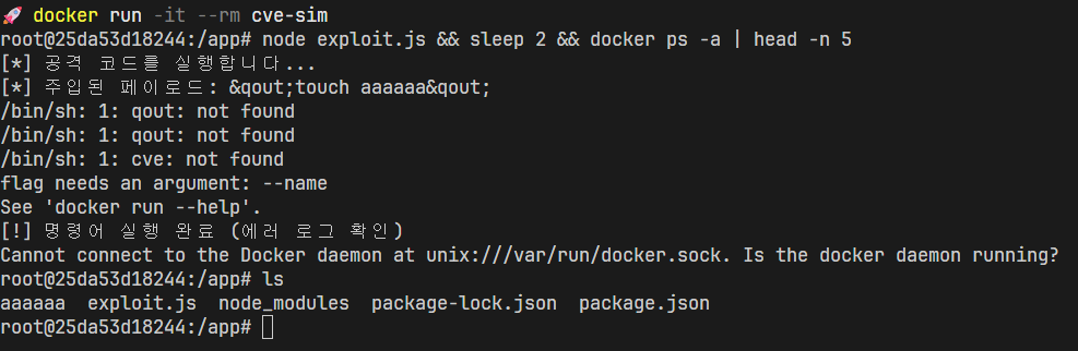 이미지를 빌드하고 실행한 뒤 node exploit.js를 입력하면, 에러 로그와 함께 aaaaaa라는 파일이 생성된 것을 볼 수 있습니다.