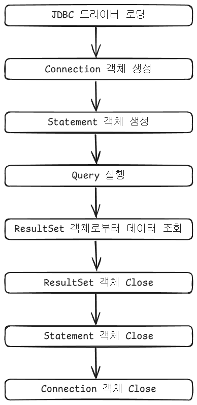 JDBC 드라이버를 로딩한 후 데이터베이스와의 연결을 담당하는 Connection 객체를 생성하고 이후에 SQL을 실행하기 위한 Statement 객체를 생성하고 쿼리를 실행하면, 그 결과는 ResultSet 객체를 통해 조회할 수 있습니다.