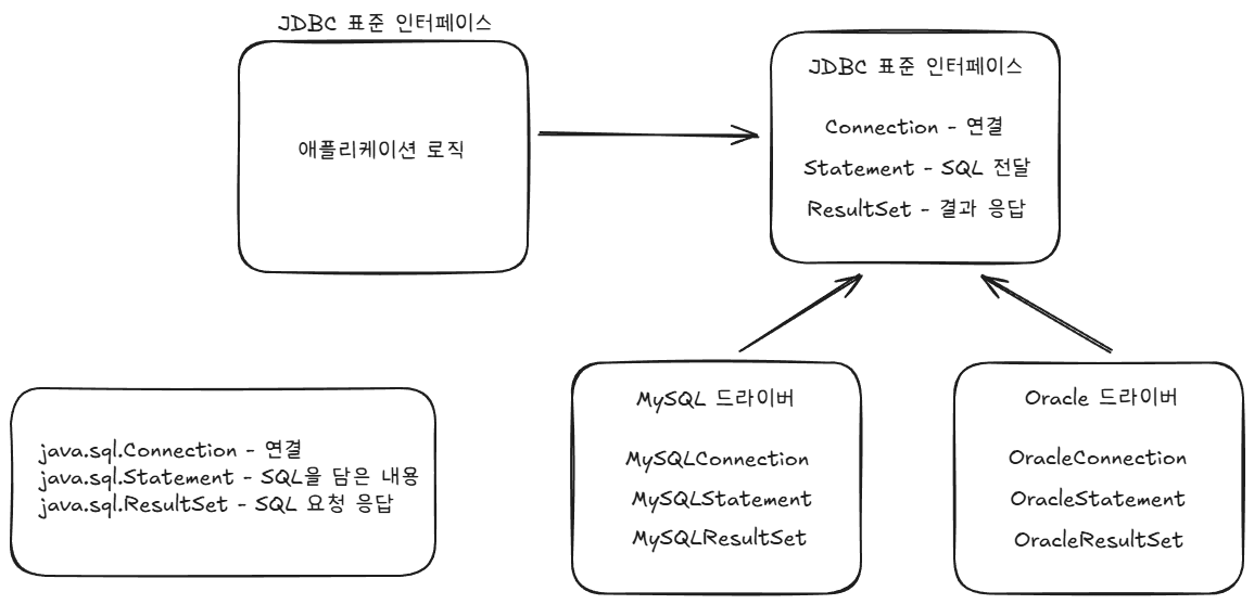 담당하게 되고 이 구조 덕분에 개발자는 종류에 상관없이 표준화된 JDBC API만 사용하면 됩니다.