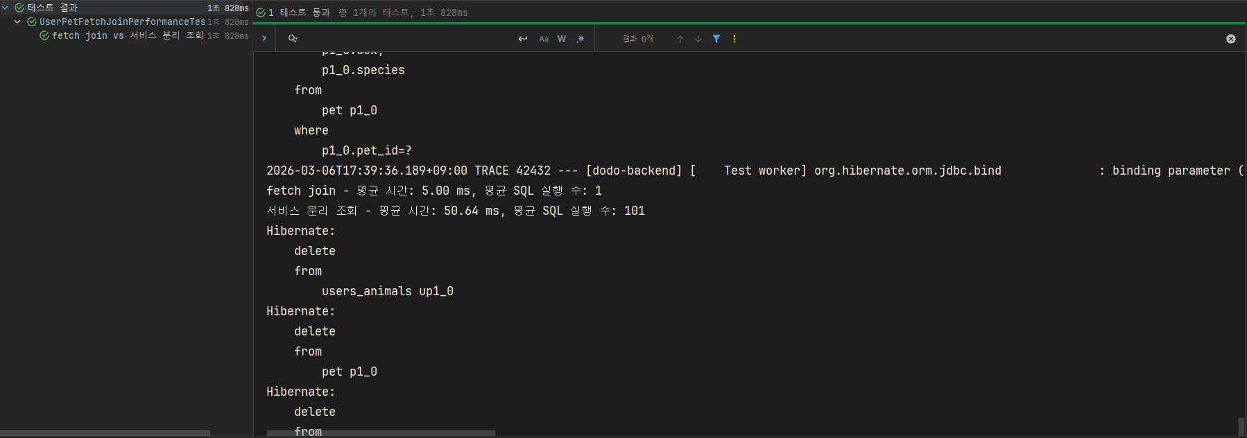 먼저 Fetch Join 방식은 UserPet을 조회하는 시점에 Pet까지 함께 가져오도록 구성했습니다.