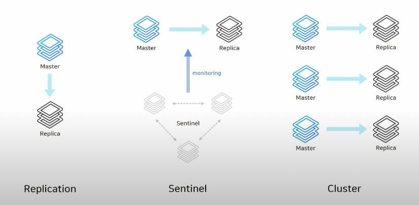이를 고려하지 않는다면 단일 Redis만 존재하는 Standalone형태를 사용하지만 고려한다면 Replication, Sentinel, Cluster을 사용합니다.