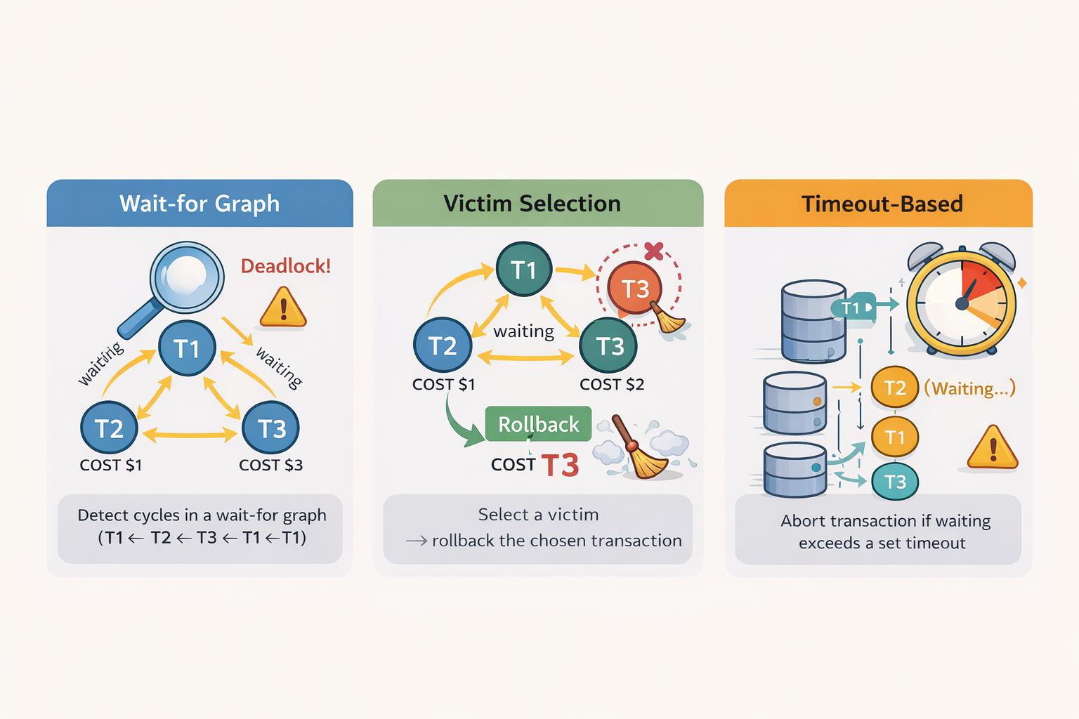 일부 DB는 단순하게 일정 시간 이상 대기하면 강제 종료하는 방식도 사용하지만 이 방식은 진짜 DeadLock이 아닌 단순 지연까지 잘못 감지할 수 있기 때문에 보통은 보조 수단으로 사용됩니다.