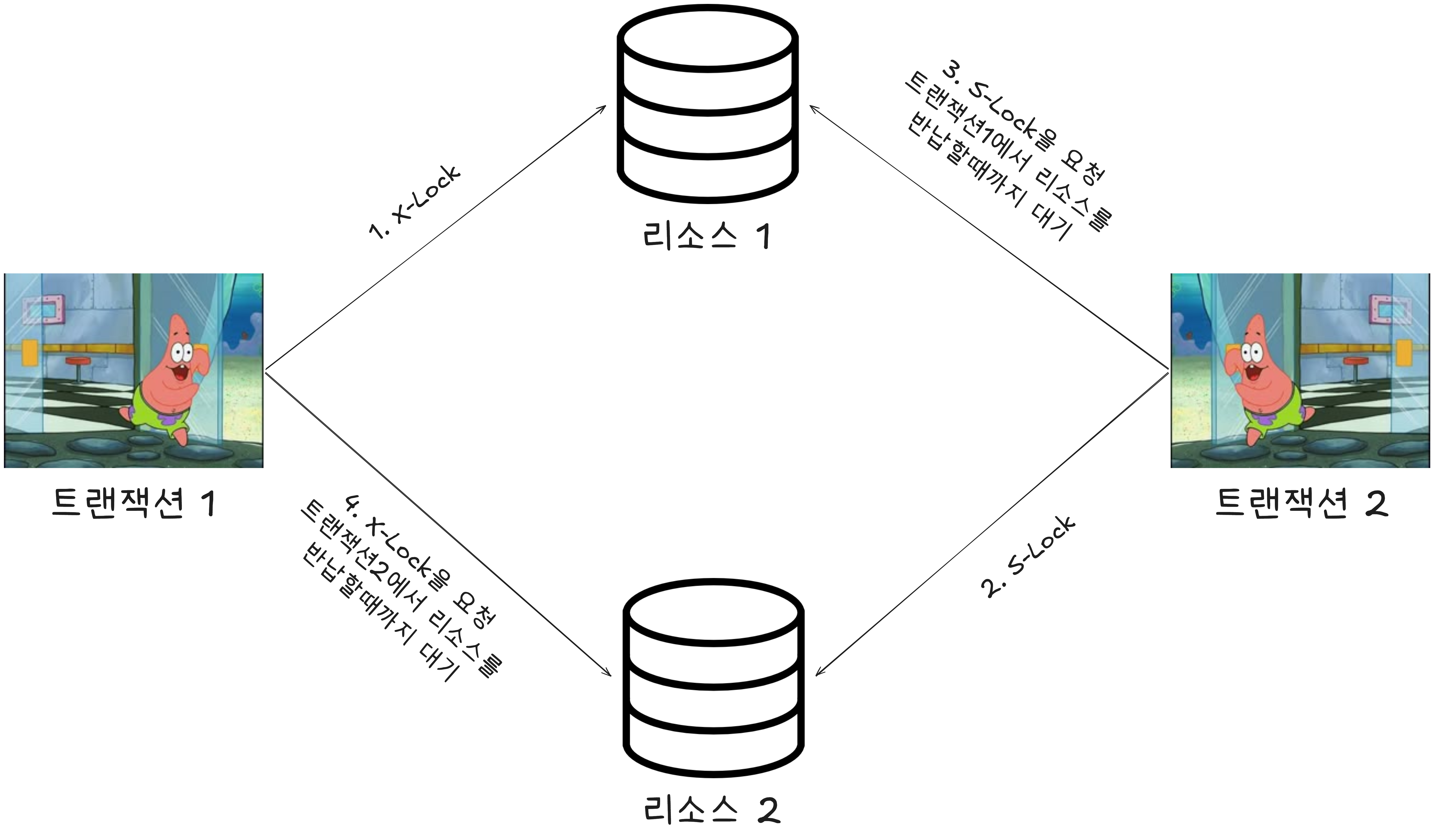 X-Lock을 요청한다.- 리소스 2는 트랜잭션 2가