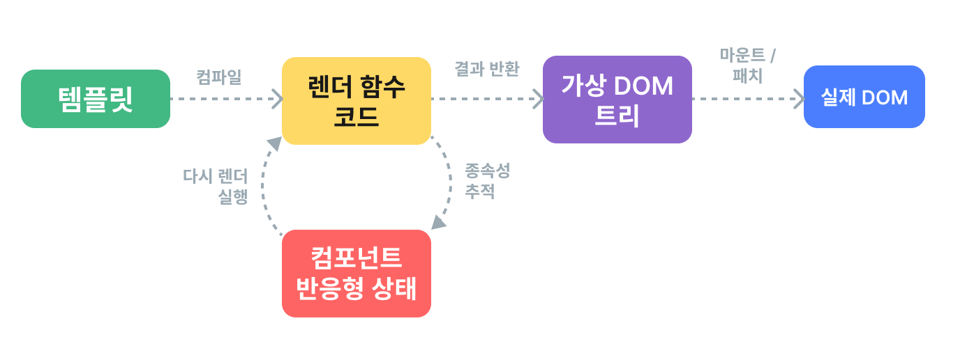 | 상태 관리 | 반응형 시스템 기반 자동 추적 | 상태 변경 시 Virtual DOM diffing |
